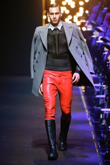 Sulla passerella Autunno/Inverno 2016-2017 di Dirk Bikkembergs sfila un sexy motociclista con addominali in mostra che indossa chiodi in pelle, pantaloni ultra aderenti, giacche di pelliccia e smanicati che lasciano scoperti i bicipiti.