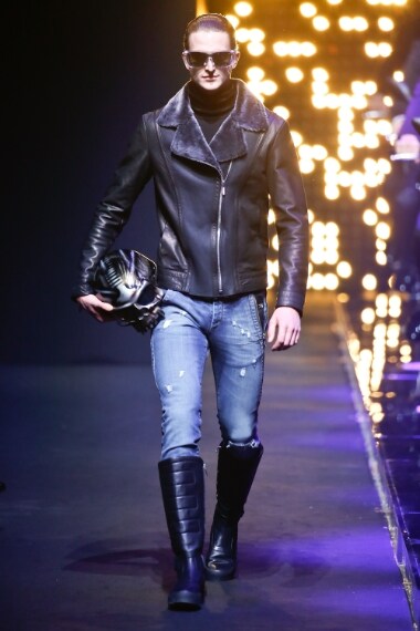 Sulla passerella Autunno/Inverno 2016-2017 di Dirk Bikkembergs sfila un sexy motociclista con addominali in mostra che indossa chiodi in pelle, pantaloni ultra aderenti, giacche di pelliccia e smanicati che lasciano scoperti i bicipiti.