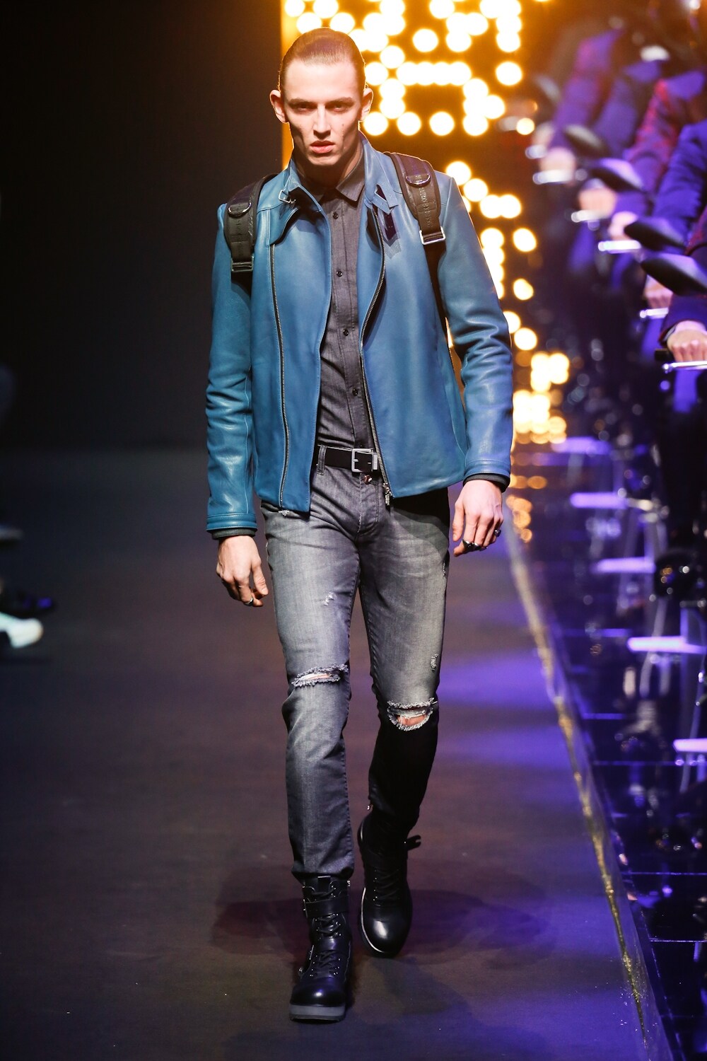 Sulla passerella Autunno/Inverno 2016-2017 di Dirk Bikkembergs sfila un sexy motociclista con addominali in mostra che indossa chiodi in pelle, pantaloni ultra aderenti, giacche di pelliccia e smanicati che lasciano scoperti i bicipiti.