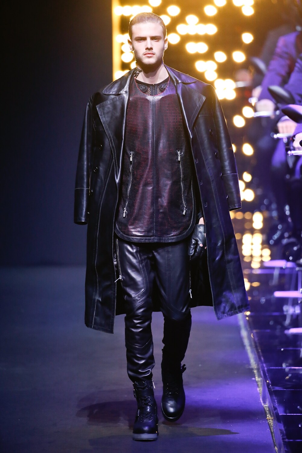 Sulla passerella Autunno/Inverno 2016-2017 di Dirk Bikkembergs sfila un sexy motociclista con addominali in mostra che indossa chiodi in pelle, pantaloni ultra aderenti, giacche di pelliccia e smanicati che lasciano scoperti i bicipiti.