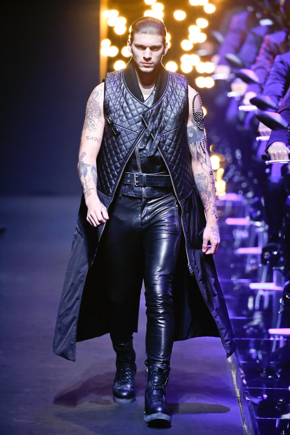 Sulla passerella Autunno/Inverno 2016-2017 di Dirk Bikkembergs sfila un sexy motociclista con addominali in mostra che indossa chiodi in pelle, pantaloni ultra aderenti, giacche di pelliccia e smanicati che lasciano scoperti i bicipiti.