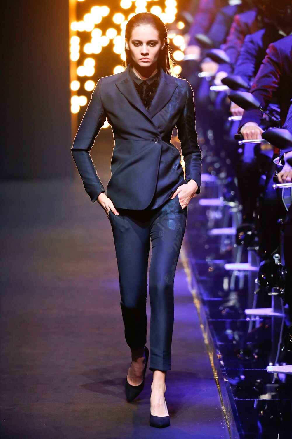 Sulla passerella Autunno/Inverno 2016-2017 di Dirk Bikkembergs sfila un sexy motociclista con addominali in mostra che indossa chiodi in pelle, pantaloni ultra aderenti, giacche di pelliccia e smanicati che lasciano scoperti i bicipiti.