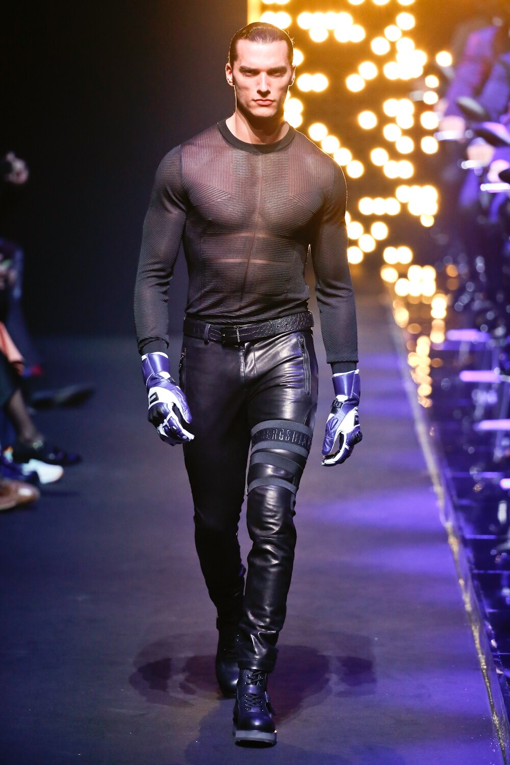 Sulla passerella Autunno/Inverno 2016-2017 di Dirk Bikkembergs sfila un sexy motociclista con addominali in mostra che indossa chiodi in pelle, pantaloni ultra aderenti, giacche di pelliccia e smanicati che lasciano scoperti i bicipiti.
