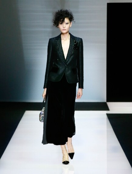 Il velluto è il protagonista sulla passerella Autunno/Inverno 2016-17 di Giorgio Armani che alla Milano Fashion Week presenta dai colori scuri in cui completi che sembrano rubati al guardaroba femminile si alternano ad abiti iperfemminili decorati con tulle, pizzi, trasparenze fantasie floreali astratte