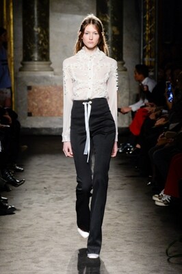 La nuova collezione invernale di Francesco Scognamiglio prende spunto da quello che succede musicalmente nel Rosenkavalier (Il Cavaliere della Rosa), una delle opere più famose di Richard Strauss: vi si assiste al frantumarsi della musica melodica ottocentesca in una nuova armonia dissonante, più moderna, più spigolosa, ma sempre eccelsa. Allo stesso modo, l’abito femminile tradizionale si scompone letteralmente e si strappa come se cercasse nuovi significati, nuove prospettive. I frammenti diventano drappeggi di ruches. I tagli, cascate di volant. Le stampe usano l’architettura scultorea dei ricami per definire disegni e pattern. E i pantaloni, pensati come lo stelo di un fiore, sbocciano sopra i fianchi aprendosi in una corolla multiforme. È una polifonia della femminilità, un’esplosione controllata di dettagli, finiture e maestrie artigiani che impegnano il massimo del savoir faire Made in Italy. Lilla elettrico. Bianco nuvola. Azzurro polvere. Oro. Maculato. Nero. Una tinta eterea di turchese. I colori sono sofisticati e delicati. E gli stivaletti alla cavallerizza, di ispirazione fetish, fanno da contrappunto al romanticismo diffuso. Lo show è un crescendo: lane maschili, bouclé floreali, velluti morbidi e fluidi aprono la collezione. È un prêt-à-porter d’eccellenza, un look severo, quasi militare nella forma, che conduce a un finale di creazioni couture. Macramè scultorei ottenuti da ricami a filo piazzati sulle forme femminili. Cristalli a filo di lurex ricamati sopra stampe floreali. La part finale della collezione non è solo un tributo al massimo dell’abilità italiana artigianale. È anche un invito a riflettere sulla necessita di qualità ed eccellenza in un momento in cui il mercato sembra spingere soltanto sulla velocità di prodotti senza passione e senza durevolezza.