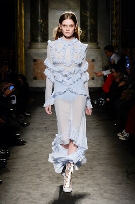 La nuova collezione invernale di Francesco Scognamiglio prende spunto da quello che succede musicalmente nel Rosenkavalier (Il Cavaliere della Rosa), una delle opere più famose di Richard Strauss: vi si assiste al frantumarsi della musica melodica ottocentesca in una nuova armonia dissonante, più moderna, più spigolosa, ma sempre eccelsa. Allo stesso modo, l’abito femminile tradizionale si scompone letteralmente e si strappa come se cercasse nuovi significati, nuove prospettive. I frammenti diventano drappeggi di ruches. I tagli, cascate di volant. Le stampe usano l’architettura scultorea dei ricami per definire disegni e pattern. E i pantaloni, pensati come lo stelo di un fiore, sbocciano sopra i fianchi aprendosi in una corolla multiforme. È una polifonia della femminilità, un’esplosione controllata di dettagli, finiture e maestrie artigiani che impegnano il massimo del savoir faire Made in Italy. Lilla elettrico. Bianco nuvola. Azzurro polvere. Oro. Maculato. Nero. Una tinta eterea di turchese. I colori sono sofisticati e delicati. E gli stivaletti alla cavallerizza, di ispirazione fetish, fanno da contrappunto al romanticismo diffuso. Lo show è un crescendo: lane maschili, bouclé floreali, velluti morbidi e fluidi aprono la collezione. È un prêt-à-porter d’eccellenza, un look severo, quasi militare nella forma, che conduce a un finale di creazioni couture. Macramè scultorei ottenuti da ricami a filo piazzati sulle forme femminili. Cristalli a filo di lurex ricamati sopra stampe floreali. La part finale della collezione non è solo un tributo al massimo dell’abilità italiana artigianale. È anche un invito a riflettere sulla necessita di qualità ed eccellenza in un momento in cui il mercato sembra spingere soltanto sulla velocità di prodotti senza passione e senza durevolezza.