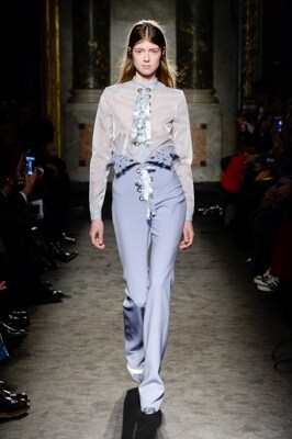 La nuova collezione invernale di Francesco Scognamiglio prende spunto da quello che succede musicalmente nel Rosenkavalier (Il Cavaliere della Rosa), una delle opere più famose di Richard Strauss: vi si assiste al frantumarsi della musica melodica ottocentesca in una nuova armonia dissonante, più moderna, più spigolosa, ma sempre eccelsa. Allo stesso modo, l’abito femminile tradizionale si scompone letteralmente e si strappa come se cercasse nuovi significati, nuove prospettive. I frammenti diventano drappeggi di ruches. I tagli, cascate di volant. Le stampe usano l’architettura scultorea dei ricami per definire disegni e pattern. E i pantaloni, pensati come lo stelo di un fiore, sbocciano sopra i fianchi aprendosi in una corolla multiforme. È una polifonia della femminilità, un’esplosione controllata di dettagli, finiture e maestrie artigiani che impegnano il massimo del savoir faire Made in Italy. Lilla elettrico. Bianco nuvola. Azzurro polvere. Oro. Maculato. Nero. Una tinta eterea di turchese. I colori sono sofisticati e delicati. E gli stivaletti alla cavallerizza, di ispirazione fetish, fanno da contrappunto al romanticismo diffuso. Lo show è un crescendo: lane maschili, bouclé floreali, velluti morbidi e fluidi aprono la collezione. È un prêt-à-porter d’eccellenza, un look severo, quasi militare nella forma, che conduce a un finale di creazioni couture. Macramè scultorei ottenuti da ricami a filo piazzati sulle forme femminili. Cristalli a filo di lurex ricamati sopra stampe floreali. La part finale della collezione non è solo un tributo al massimo dell’abilità italiana artigianale. È anche un invito a riflettere sulla necessita di qualità ed eccellenza in un momento in cui il mercato sembra spingere soltanto sulla velocità di prodotti senza passione e senza durevolezza.
