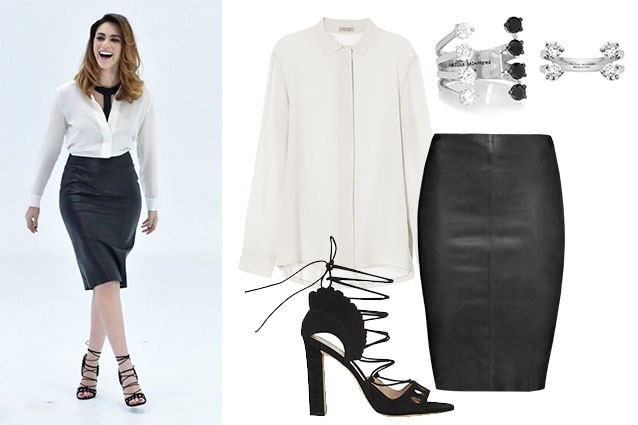 Per la puntata del 3 aprile 2016 de "Le iene show" Miriam Leone sceglie un look in bianco e nero con camicia maschile, gonna in pelle e tacchi alti. Dai gioielli ai sandali stringati, ecco tutti i dettagli dell'outfit di Miriam Leone