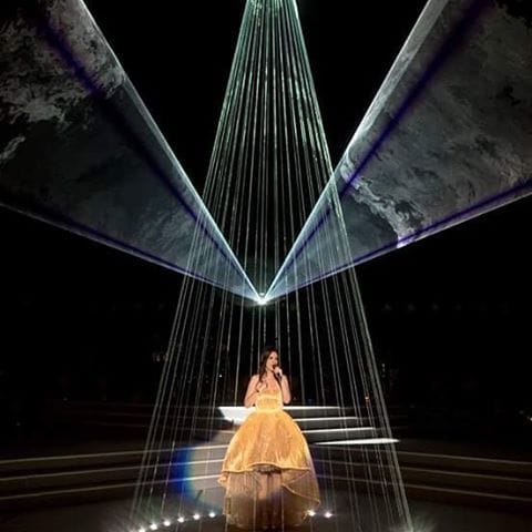 In occasione del Simili tour, che ha debuttato a Milano il 4 giugno, Laura Pausini si è presentata sul palco con dei look incredibilmente glamour. Uno degli abiti più belli è quello realizzato da Byblos Milano con lo speciale tessuto luminoso in fibra ottica Dreamlux. E' stato capace di far brillare l'artista.