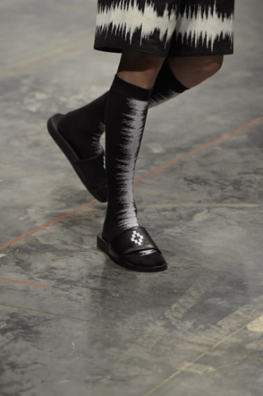 Culture diverse, ispirazioni opposte, stili distanti si mescolano e si uniscono sulla passerella Primavera/Estate 2017 di Marcelo Burlon County of Milan, brand che disegna un guardaroba "multiculturale" che sfrutta il meltin pot come una forza, una base su cui costruire l'immagine di un uomo e di una donna dalla forte personalità, dallo stile stratificato. Numeri, intrecci grafici di stelle ninja con i simboli della Patagonia, marchio di fabbrica del brand, spuntano su maxi shirt, felpe, bermuda e bomber, mentre i completi kimono restano puliti in total black. A completare i look sandali intrecciati, ciabatte indossate su calzettoni sporty di spugna e boots stringati dalla suola carro armato.