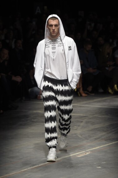 Culture diverse, ispirazioni opposte, stili distanti si mescolano e si uniscono sulla passerella Primavera/Estate 2017 di Marcelo Burlon County of Milan, brand che disegna un guardaroba "multiculturale" che sfrutta il meltin pot come una forza, una base su cui costruire l'immagine di un uomo e di una donna dalla forte personalità, dallo stile stratificato. Numeri, intrecci grafici di stelle ninja con i simboli della Patagonia, marchio di fabbrica del brand, spuntano su maxi shirt, felpe, bermuda e bomber, mentre i completi kimono restano puliti in total black. A completare i look sandali intrecciati, ciabatte indossate su calzettoni sporty di spugna e boots stringati dalla suola carro armato.