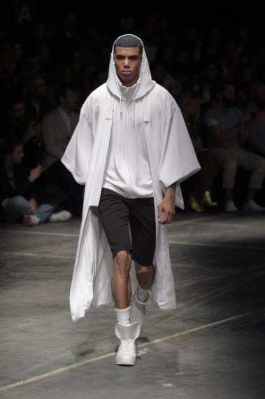 Culture diverse, ispirazioni opposte, stili distanti si mescolano e si uniscono sulla passerella Primavera/Estate 2017 di Marcelo Burlon County of Milan, brand che disegna un guardaroba "multiculturale" che sfrutta il meltin pot come una forza, una base su cui costruire l'immagine di un uomo e di una donna dalla forte personalità, dallo stile stratificato. Numeri, intrecci grafici di stelle ninja con i simboli della Patagonia, marchio di fabbrica del brand, spuntano su maxi shirt, felpe, bermuda e bomber, mentre i completi kimono restano puliti in total black. A completare i look sandali intrecciati, ciabatte indossate su calzettoni sporty di spugna e boots stringati dalla suola carro armato.