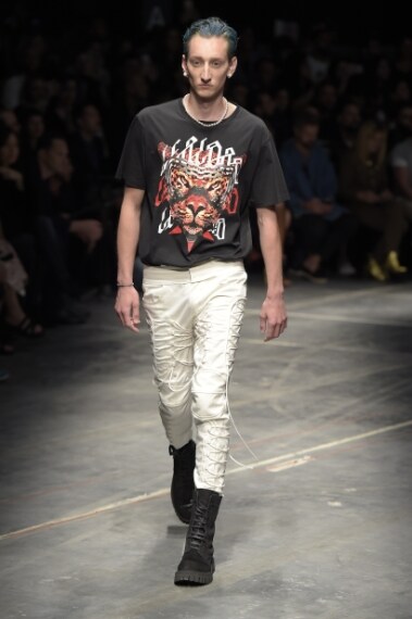 Culture diverse, ispirazioni opposte, stili distanti si mescolano e si uniscono sulla passerella Primavera/Estate 2017 di Marcelo Burlon County of Milan, brand che disegna un guardaroba "multiculturale" che sfrutta il meltin pot come una forza, una base su cui costruire l'immagine di un uomo e di una donna dalla forte personalità, dallo stile stratificato. Numeri, intrecci grafici di stelle ninja con i simboli della Patagonia, marchio di fabbrica del brand, spuntano su maxi shirt, felpe, bermuda e bomber, mentre i completi kimono restano puliti in total black. A completare i look sandali intrecciati, ciabatte indossate su calzettoni sporty di spugna e boots stringati dalla suola carro armato.