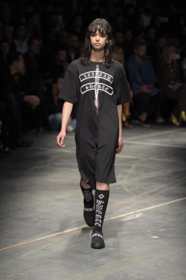 Culture diverse, ispirazioni opposte, stili distanti si mescolano e si uniscono sulla passerella Primavera/Estate 2017 di Marcelo Burlon County of Milan, brand che disegna un guardaroba "multiculturale" che sfrutta il meltin pot come una forza, una base su cui costruire l'immagine di un uomo e di una donna dalla forte personalità, dallo stile stratificato. Numeri, intrecci grafici di stelle ninja con i simboli della Patagonia, marchio di fabbrica del brand, spuntano su maxi shirt, felpe, bermuda e bomber, mentre i completi kimono restano puliti in total black. A completare i look sandali intrecciati, ciabatte indossate su calzettoni sporty di spugna e boots stringati dalla suola carro armato.