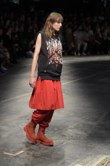 Culture diverse, ispirazioni opposte, stili distanti si mescolano e si uniscono sulla passerella Primavera/Estate 2017 di Marcelo Burlon County of Milan, brand che disegna un guardaroba "multiculturale" che sfrutta il meltin pot come una forza, una base su cui costruire l'immagine di un uomo e di una donna dalla forte personalità, dallo stile stratificato. Numeri, intrecci grafici di stelle ninja con i simboli della Patagonia, marchio di fabbrica del brand, spuntano su maxi shirt, felpe, bermuda e bomber, mentre i completi kimono restano puliti in total black. A completare i look sandali intrecciati, ciabatte indossate su calzettoni sporty di spugna e boots stringati dalla suola carro armato.