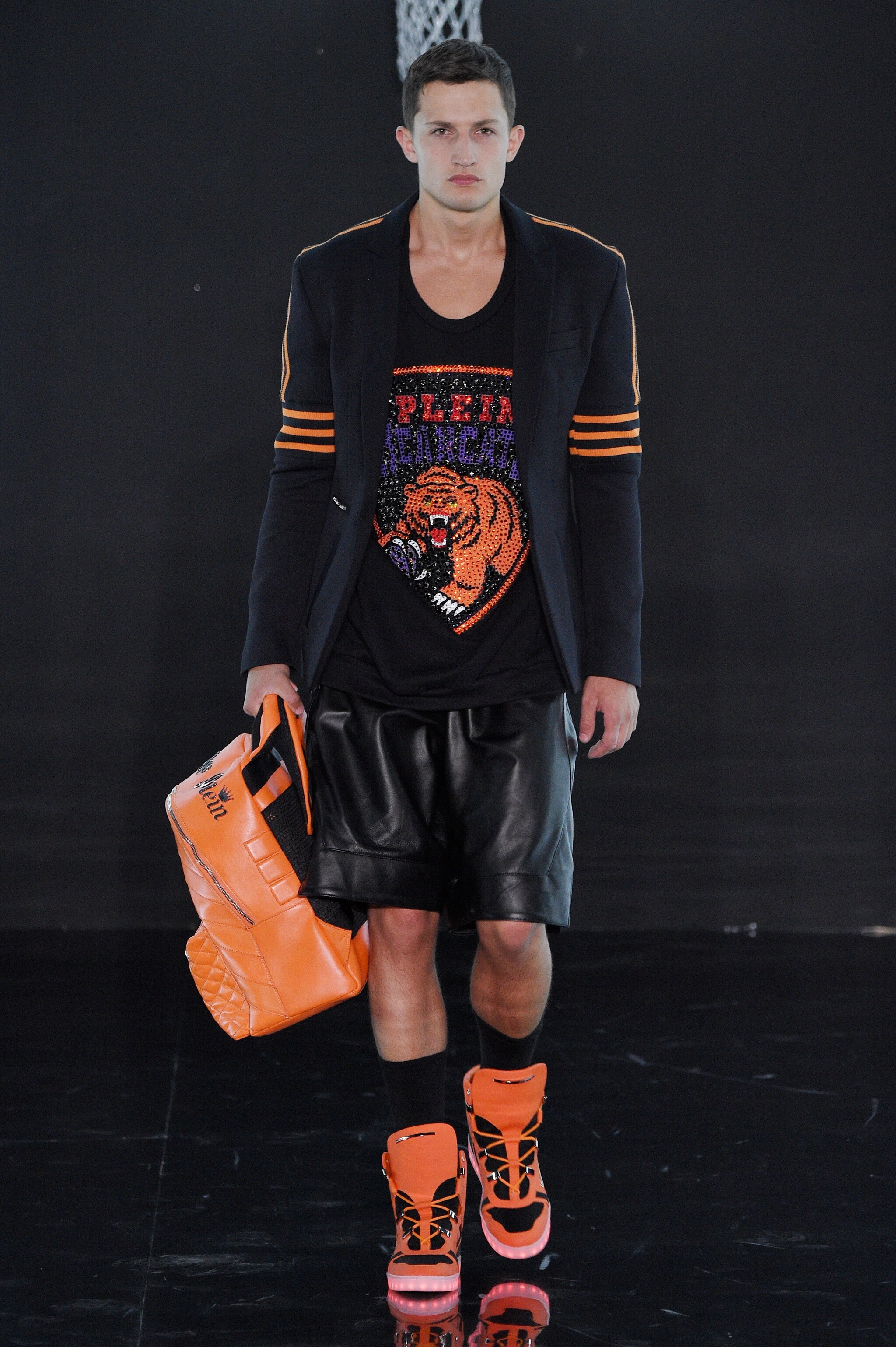 Il mondo del basket americano e delle grandi squadre rivive sulla passerella uomo Primavera/Estate 2017 di Philipp Plein, stilista che alla Fashion Week di Milano presenta una collezione composta da capi vistosi decorati da maxi stampe, applicazioni lucenti, da bomber, bermuda e giacche in pelle, il tutto condito con sneakers dalla suola luminosa o con maxi logo.