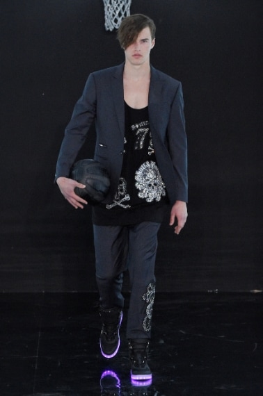 Il mondo del basket americano e delle grandi squadre rivive sulla passerella uomo Primavera/Estate 2017 di Philipp Plein, stilista che alla Fashion Week di Milano presenta una collezione composta da capi vistosi decorati da maxi stampe, applicazioni lucenti, da bomber, bermuda e giacche in pelle, il tutto condito con sneakers dalla suola luminosa o con maxi logo.