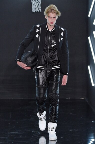 Il mondo del basket americano e delle grandi squadre rivive sulla passerella uomo Primavera/Estate 2017 di Philipp Plein, stilista che alla Fashion Week di Milano presenta una collezione composta da capi vistosi decorati da maxi stampe, applicazioni lucenti, da bomber, bermuda e giacche in pelle, il tutto condito con sneakers dalla suola luminosa o con maxi logo.
