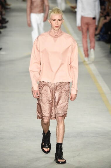 Linee slim contrapposte a silhouette extra large, colori tenui, come il bianco il beige e il cipria, contrapposti a tonalità scure e decise di blu notte e nero si alternano sulla passerella uomo Primavera/Estate 2017 di Diesel Black Gold.