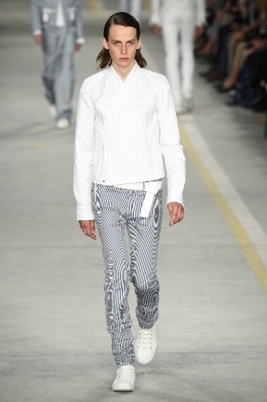 Linee slim contrapposte a silhouette extra large, colori tenui, come il bianco il beige e il cipria, contrapposti a tonalità scure e decise di blu notte e nero si alternano sulla passerella uomo Primavera/Estate 2017 di Diesel Black Gold.