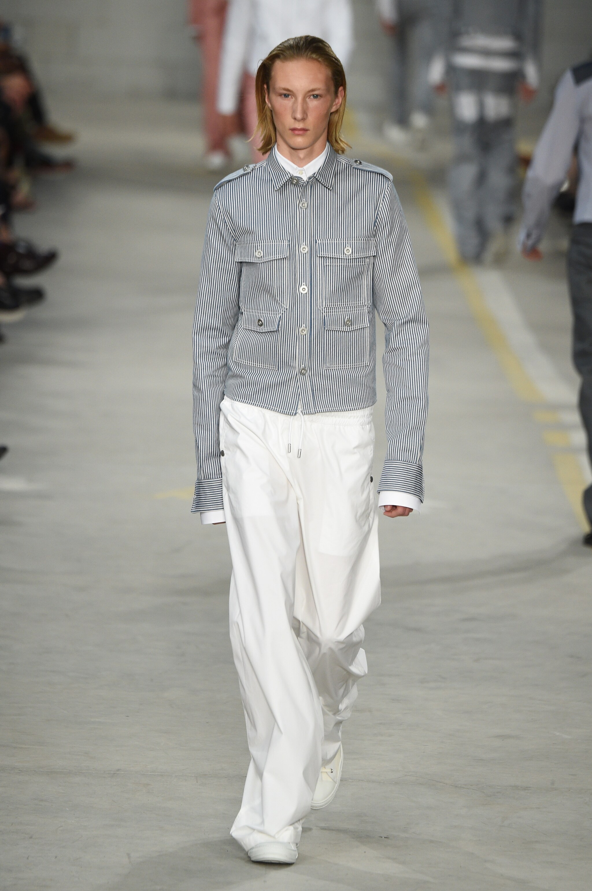 Linee slim contrapposte a silhouette extra large, colori tenui, come il bianco il beige e il cipria, contrapposti a tonalità scure e decise di blu notte e nero si alternano sulla passerella uomo Primavera/Estate 2017 di Diesel Black Gold.