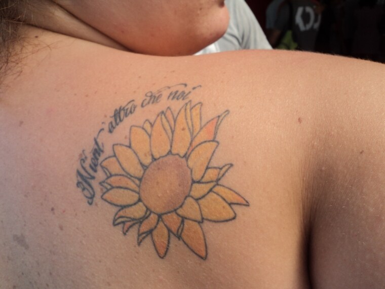 • Tatuaggio con fiori colorati sul braccio e grande girasole sulla spalla.