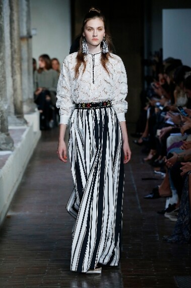 Pizzi e romantici merletti si mescolano con maxi righe, frange e stampe floreali nella collezione Primavera/Estate 2017 di Blugirl. Per la sua seconda linea Anna Molinari disegna una donna dall'animo doppio, un po' hippie, un po' chic, che ama indossare lunghi abiti neri con dettagli trasparenti, capi dai decori folk, maxi gonne a balze e leziosi abitini bianchi. Ai piedi sandali flatform dalle linee iper moderne, in testa grossi cappelli a tesa larga.