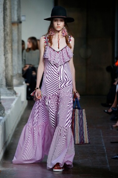 Pizzi e romantici merletti si mescolano con maxi righe, frange e stampe floreali nella collezione Primavera/Estate 2017 di Blugirl. Per la sua seconda linea Anna Molinari disegna una donna dall'animo doppio, un po' hippie, un po' chic, che ama indossare lunghi abiti neri con dettagli trasparenti, capi dai decori folk, maxi gonne a balze e leziosi abitini bianchi. Ai piedi sandali flatform dalle linee iper moderne, in testa grossi cappelli a tesa larga.