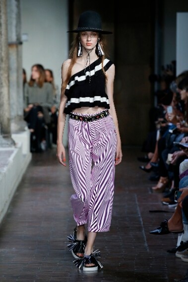 Pizzi e romantici merletti si mescolano con maxi righe, frange e stampe floreali nella collezione Primavera/Estate 2017 di Blugirl. Per la sua seconda linea Anna Molinari disegna una donna dall'animo doppio, un po' hippie, un po' chic, che ama indossare lunghi abiti neri con dettagli trasparenti, capi dai decori folk, maxi gonne a balze e leziosi abitini bianchi. Ai piedi sandali flatform dalle linee iper moderne, in testa grossi cappelli a tesa larga.