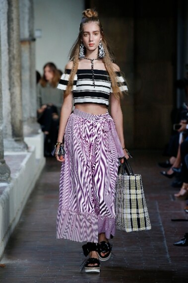 Pizzi e romantici merletti si mescolano con maxi righe, frange e stampe floreali nella collezione Primavera/Estate 2017 di Blugirl. Per la sua seconda linea Anna Molinari disegna una donna dall'animo doppio, un po' hippie, un po' chic, che ama indossare lunghi abiti neri con dettagli trasparenti, capi dai decori folk, maxi gonne a balze e leziosi abitini bianchi. Ai piedi sandali flatform dalle linee iper moderne, in testa grossi cappelli a tesa larga.