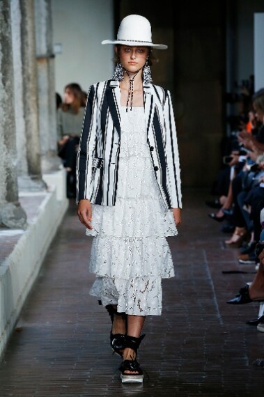 Pizzi e romantici merletti si mescolano con maxi righe, frange e stampe floreali nella collezione Primavera/Estate 2017 di Blugirl. Per la sua seconda linea Anna Molinari disegna una donna dall'animo doppio, un po' hippie, un po' chic, che ama indossare lunghi abiti neri con dettagli trasparenti, capi dai decori folk, maxi gonne a balze e leziosi abitini bianchi. Ai piedi sandali flatform dalle linee iper moderne, in testa grossi cappelli a tesa larga.