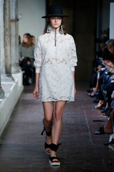 Pizzi e romantici merletti si mescolano con maxi righe, frange e stampe floreali nella collezione Primavera/Estate 2017 di Blugirl. Per la sua seconda linea Anna Molinari disegna una donna dall'animo doppio, un po' hippie, un po' chic, che ama indossare lunghi abiti neri con dettagli trasparenti, capi dai decori folk, maxi gonne a balze e leziosi abitini bianchi. Ai piedi sandali flatform dalle linee iper moderne, in testa grossi cappelli a tesa larga.