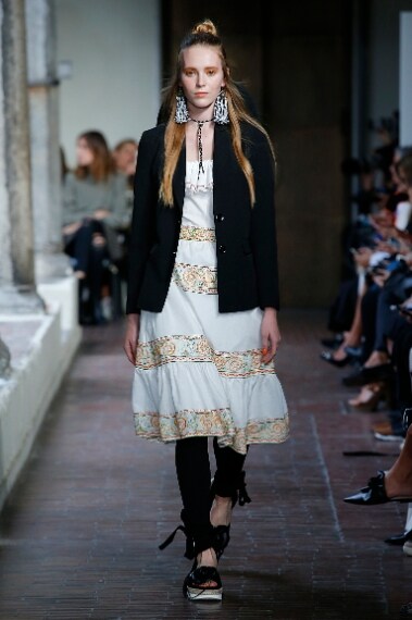Pizzi e romantici merletti si mescolano con maxi righe, frange e stampe floreali nella collezione Primavera/Estate 2017 di Blugirl. Per la sua seconda linea Anna Molinari disegna una donna dall'animo doppio, un po' hippie, un po' chic, che ama indossare lunghi abiti neri con dettagli trasparenti, capi dai decori folk, maxi gonne a balze e leziosi abitini bianchi. Ai piedi sandali flatform dalle linee iper moderne, in testa grossi cappelli a tesa larga.