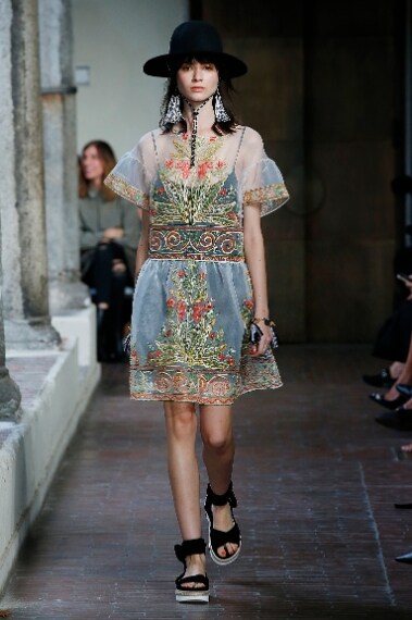 Pizzi e romantici merletti si mescolano con maxi righe, frange e stampe floreali nella collezione Primavera/Estate 2017 di Blugirl. Per la sua seconda linea Anna Molinari disegna una donna dall'animo doppio, un po' hippie, un po' chic, che ama indossare lunghi abiti neri con dettagli trasparenti, capi dai decori folk, maxi gonne a balze e leziosi abitini bianchi. Ai piedi sandali flatform dalle linee iper moderne, in testa grossi cappelli a tesa larga.