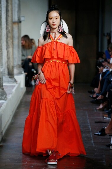 Pizzi e romantici merletti si mescolano con maxi righe, frange e stampe floreali nella collezione Primavera/Estate 2017 di Blugirl. Per la sua seconda linea Anna Molinari disegna una donna dall'animo doppio, un po' hippie, un po' chic, che ama indossare lunghi abiti neri con dettagli trasparenti, capi dai decori folk, maxi gonne a balze e leziosi abitini bianchi. Ai piedi sandali flatform dalle linee iper moderne, in testa grossi cappelli a tesa larga.