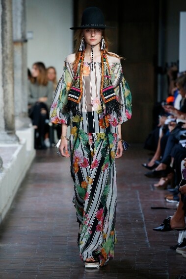 Pizzi e romantici merletti si mescolano con maxi righe, frange e stampe floreali nella collezione Primavera/Estate 2017 di Blugirl. Per la sua seconda linea Anna Molinari disegna una donna dall'animo doppio, un po' hippie, un po' chic, che ama indossare lunghi abiti neri con dettagli trasparenti, capi dai decori folk, maxi gonne a balze e leziosi abitini bianchi. Ai piedi sandali flatform dalle linee iper moderne, in testa grossi cappelli a tesa larga.