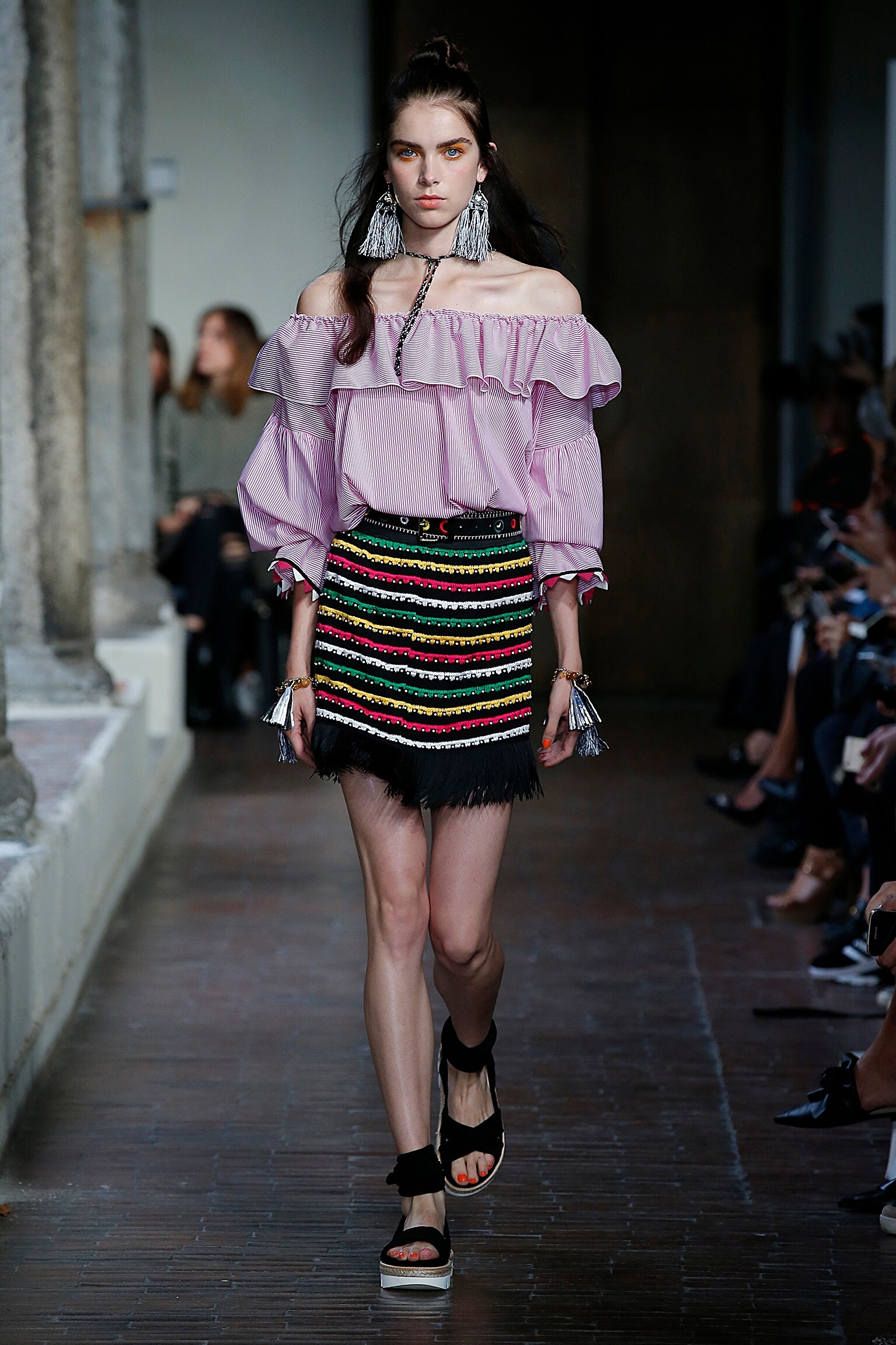 Pizzi e romantici merletti si mescolano con maxi righe, frange e stampe floreali nella collezione Primavera/Estate 2017 di Blugirl. Per la sua seconda linea Anna Molinari disegna una donna dall'animo doppio, un po' hippie, un po' chic, che ama indossare lunghi abiti neri con dettagli trasparenti, capi dai decori folk, maxi gonne a balze e leziosi abitini bianchi. Ai piedi sandali flatform dalle linee iper moderne, in testa grossi cappelli a tesa larga.