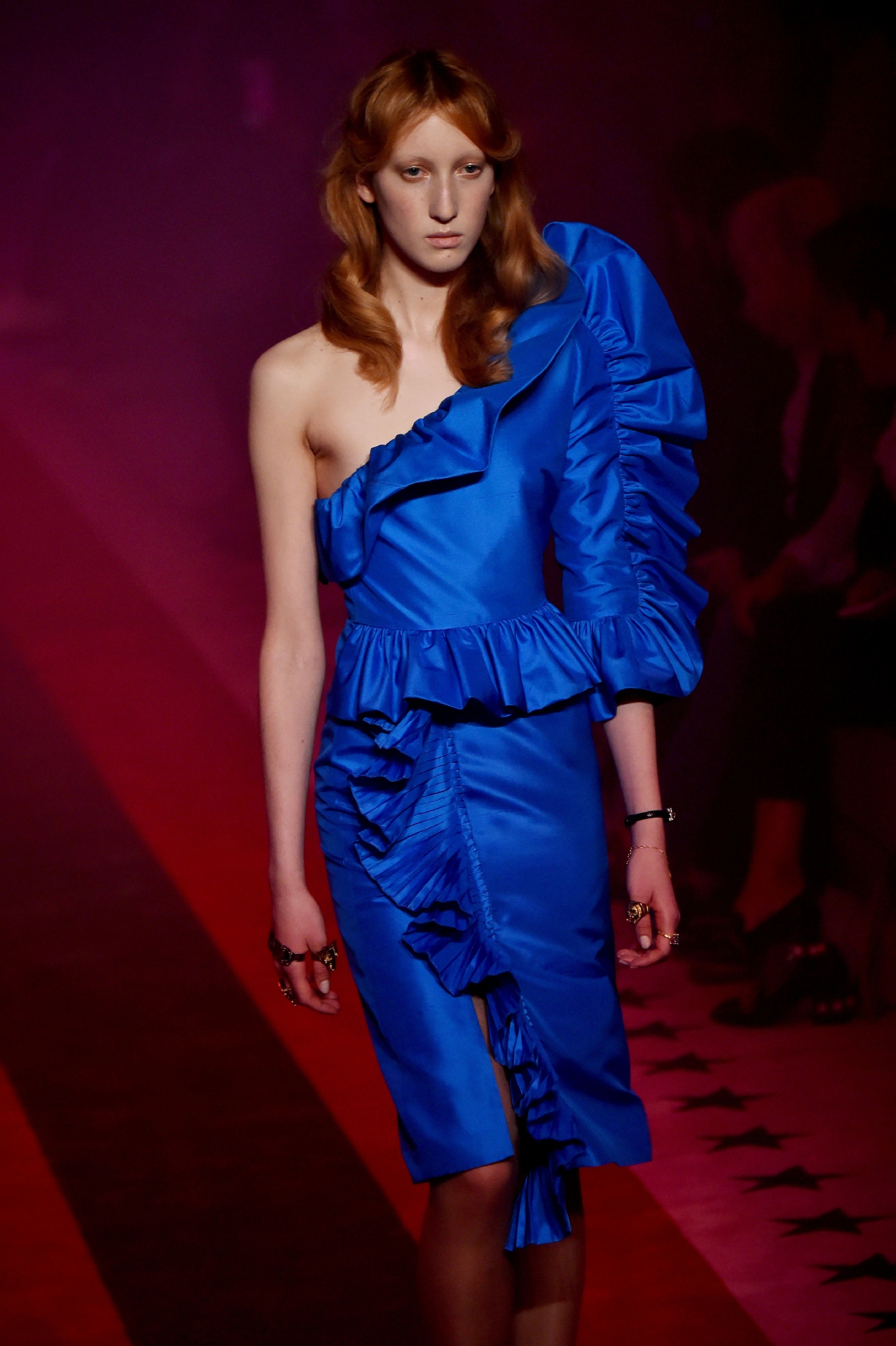 Nel primo giorno della Milano Fashion Week, la Maison Gucci ha presentato la nuova collezione Primavera/Estate 2017, disegnata dal direttore creativo Alessandro Michele. Tra bagliori metallici, zeppe, pantaloni a zampa e abiti dal fascino esotico e vintage, la sfilata si è trasformata in uno show ad alta teatralità. I must have della prossima primavera? Le maniche a sbuffo, i fiocchi, occhiali maxi e capi ispirati agli anni Ottanta.