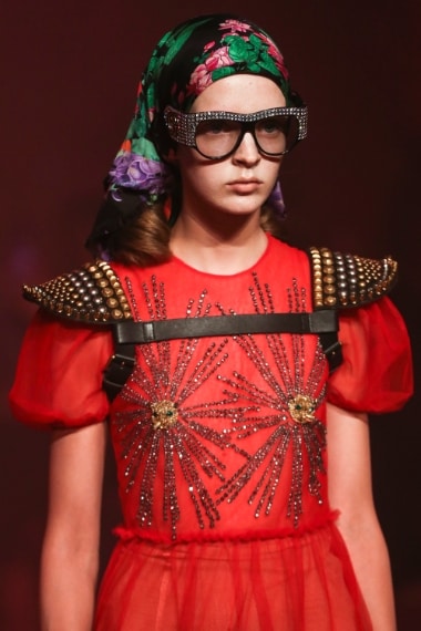 Nel primo giorno della Milano Fashion Week, la Maison Gucci ha presentato la nuova collezione Primavera/Estate 2017, disegnata dal direttore creativo Alessandro Michele. Tra bagliori metallici, zeppe, pantaloni a zampa e abiti dal fascino esotico e vintage, la sfilata si è trasformata in uno show ad alta teatralità. I must have della prossima primavera? Le maniche a sbuffo, i fiocchi, occhiali maxi e capi ispirati agli anni Ottanta.