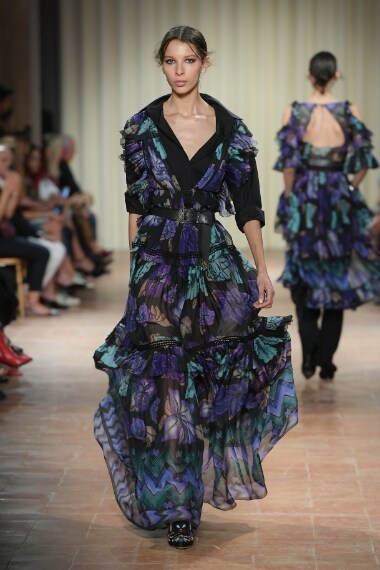 Durante la prima giornata della Milano Fashion Week, Alberta ferretti ha presentato la sua collezione donna Primavera/Estate 2017. La stilista ha portato in scena una linea di abiti dall'impronta gipsy, perfetta per una donna femminile e raffinata, caratterizzata da volumi leggeri, forme fluide, ricami floreali, crop top neri, cinture di pelle multiple e gonne lunghe arricciate e a balze