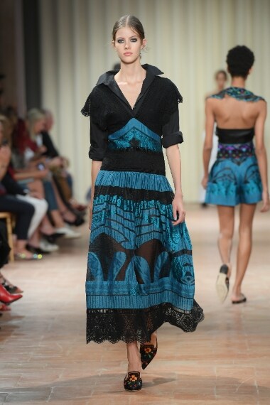 Durante la prima giornata della Milano Fashion Week, Alberta ferretti ha presentato la sua collezione donna Primavera/Estate 2017. La stilista ha portato in scena una linea di abiti dall'impronta gipsy, perfetta per una donna femminile e raffinata, caratterizzata da volumi leggeri, forme fluide, ricami floreali, crop top neri, cinture di pelle multiple e gonne lunghe arricciate e a balze
