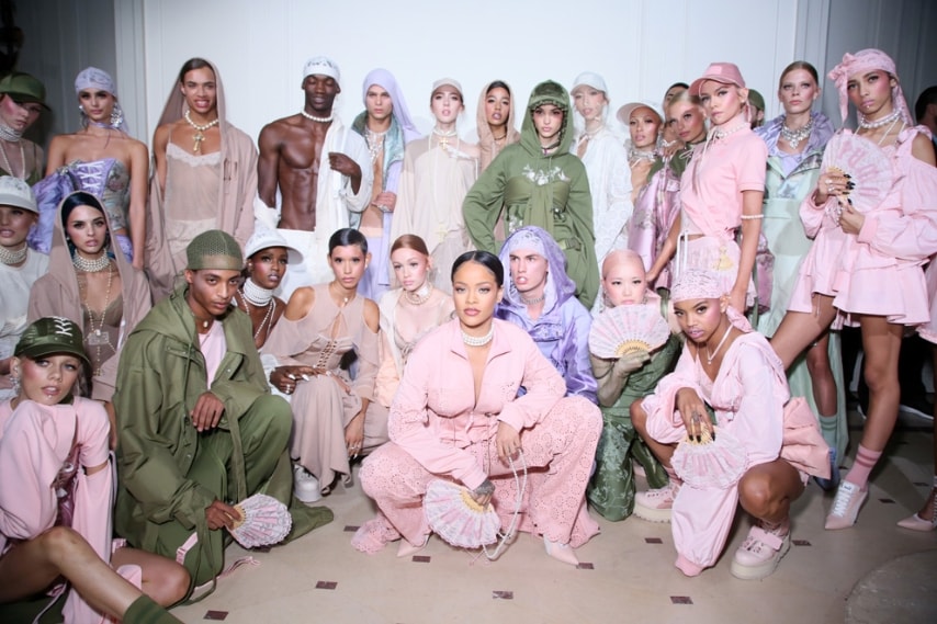 In occasione della Paris Fashion Week, Rihanna ha presentato la collezione Primavera/Estate 2017 da lei firmata Fenty by Puma. La popstar ha anche sfilato con indosso un meraviglioso completo rosa della linea ispirata alla Francia del XVIII secolo.