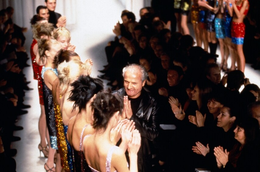 • Gianni Versace con Karen Mudler, Linda Evangelista, Christy Turlington, Claudia Schiffer e Carla Bruni