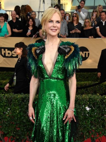 Nicole Kidman ha partecipato ieri agli Annual Screen Actors Guild Awards e, per l'occasione, ha sfoggiato un look particolarissimo. L'attrice ha indossato un abito Gucci di paillettes verdi con delle decorazioni a forma di pappagallo sulle spalle, peccato solo che la scollatura profonda abbia rivelato l'eccessiva magrezza.