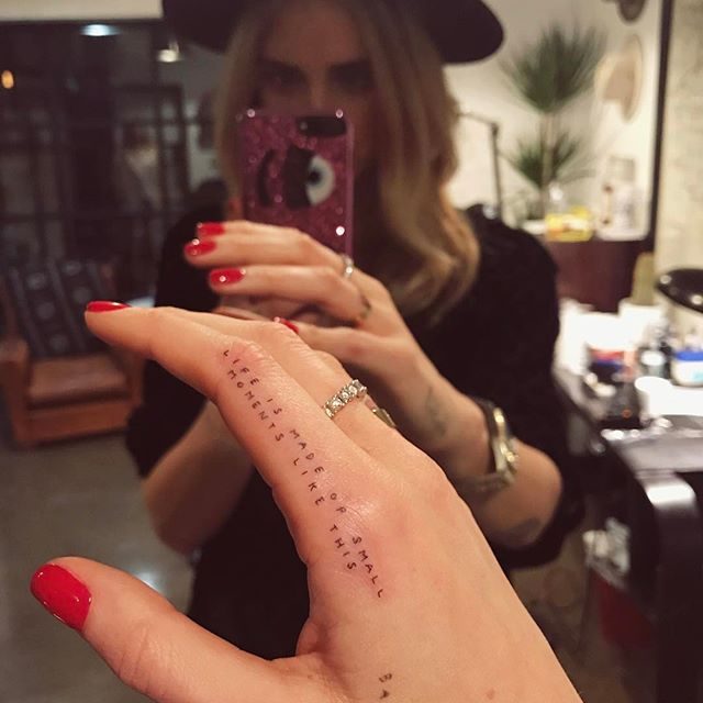 Oltre a essere appassionata di moda, Chiara Ferragni ama anche i tatuaggi. Di recente, ne ha mostrato uno nuovo su Instagram. E' una scritta che recita "Life is made of small moments like this", cioè "La vita è fatta di piccoli momenti come questo", impressa sull'indice della mano destra.