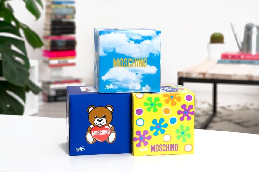 Tempo, il celebre marchio di fazzoletti, ha collaborato con la Maison Moschino per creare un'imperdibile collezione di box per la casa. Possono essere acquistati nei supermercati e sono caratterizzate da tre stampe iconiche: il teddy bear, il motivo floreale e le inconfondibili nuvole.
