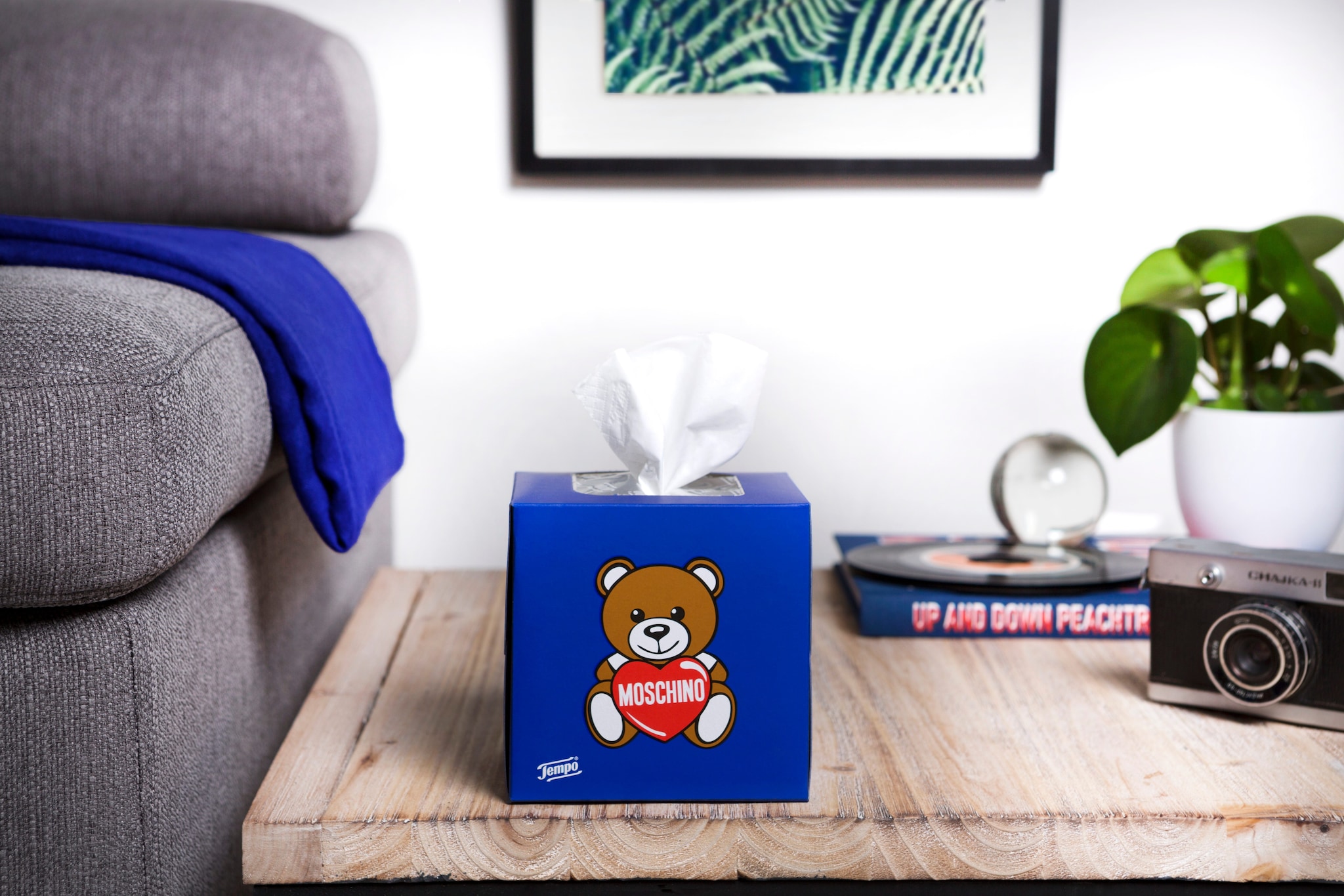 Tempo, il celebre marchio di fazzoletti, ha collaborato con la Maison Moschino per creare un'imperdibile collezione di box per la casa. Possono essere acquistati nei supermercati e sono caratterizzate da tre stampe iconiche: il teddy bear, il motivo floreale e le inconfondibili nuvole.