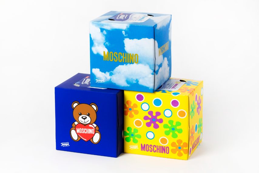 Tempo, il celebre marchio di fazzoletti, ha collaborato con la Maison Moschino per creare un'imperdibile collezione di box per la casa. Possono essere acquistati nei supermercati e sono caratterizzate da tre stampe iconiche: il teddy bear, il motivo floreale e le inconfondibili nuvole.