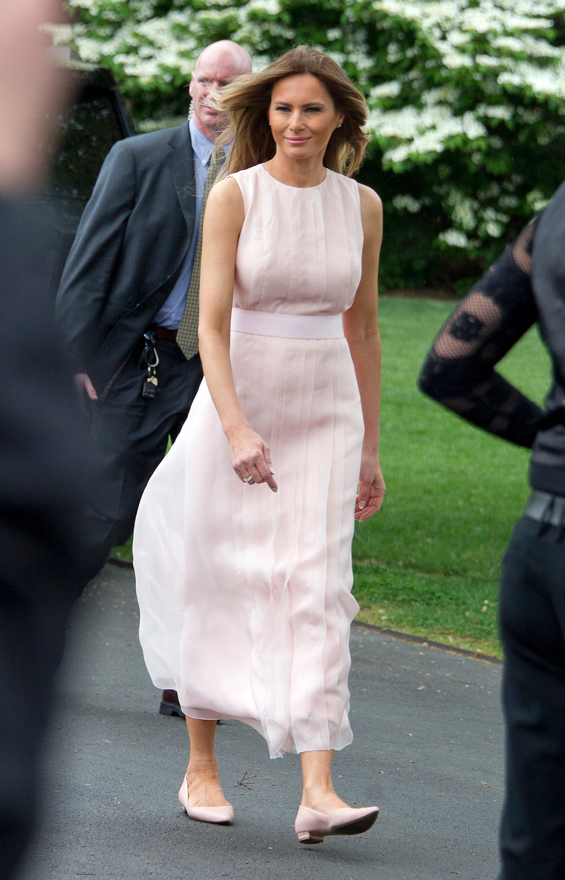 In occasione dell'annuale festa Easter Egg Roll, Melania Trump ha sfoggiato un look inedito. La First Lady ha scelto di dire addio ai tacchi e agli abiti aderenti per dare spazio a un outfit da fata. Ha sfoggiato un abito rosa pastello firmato Hervé Pierre con delle ballerine a punta dello stesso colore di Christian Louboutin.