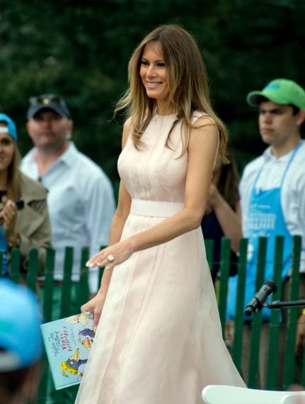 In occasione dell'annuale festa Easter Egg Roll, Melania Trump ha sfoggiato un look inedito. La First Lady ha scelto di dire addio ai tacchi e agli abiti aderenti per dare spazio a un outfit da fata. Ha sfoggiato un abito rosa pastello firmato Hervé Pierre con delle ballerine a punta dello stesso colore di Christian Louboutin.